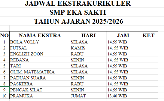 Upaya peningkatan potensi peserta didik diberikan wadah berupa kegiatan ekstrakurikuler. Kegiatan ekstrakurikuler SMP Eka Sakti terdiri atas :